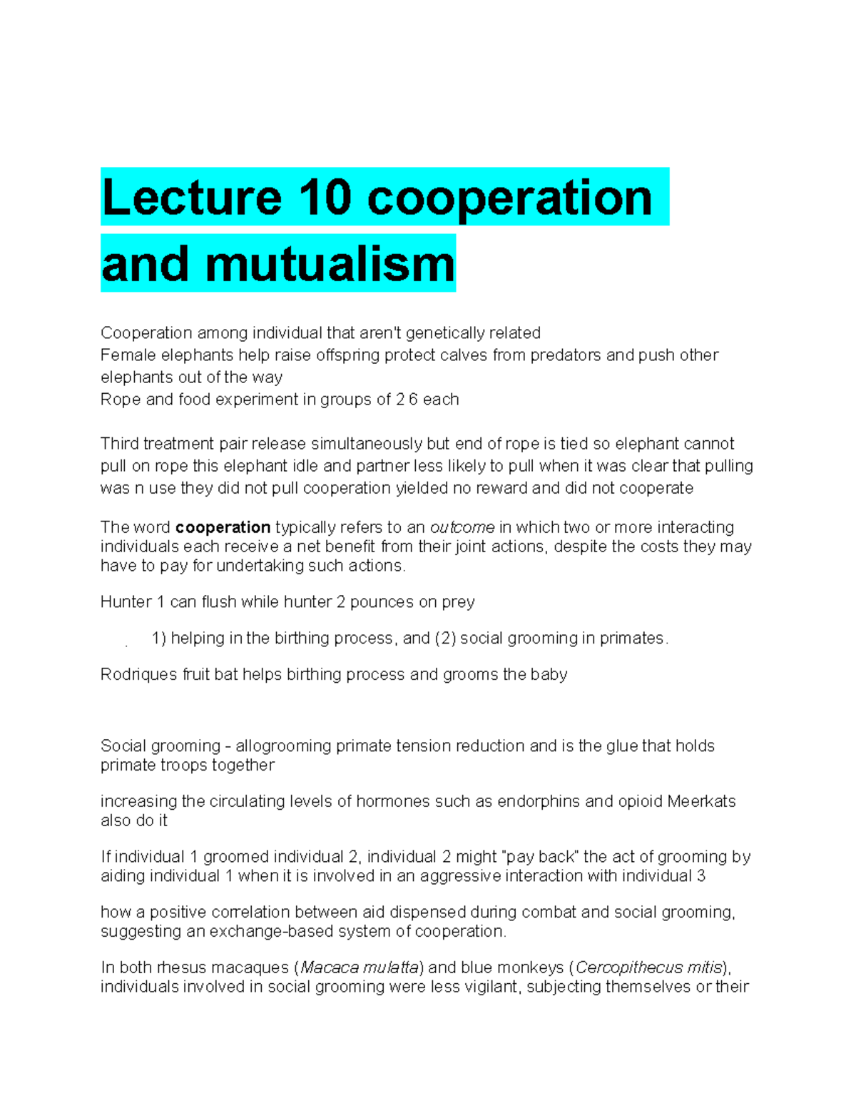 2021 Animal Behavior Lecture Notes Chapter 10 Mutualism Bio 338 Studocu